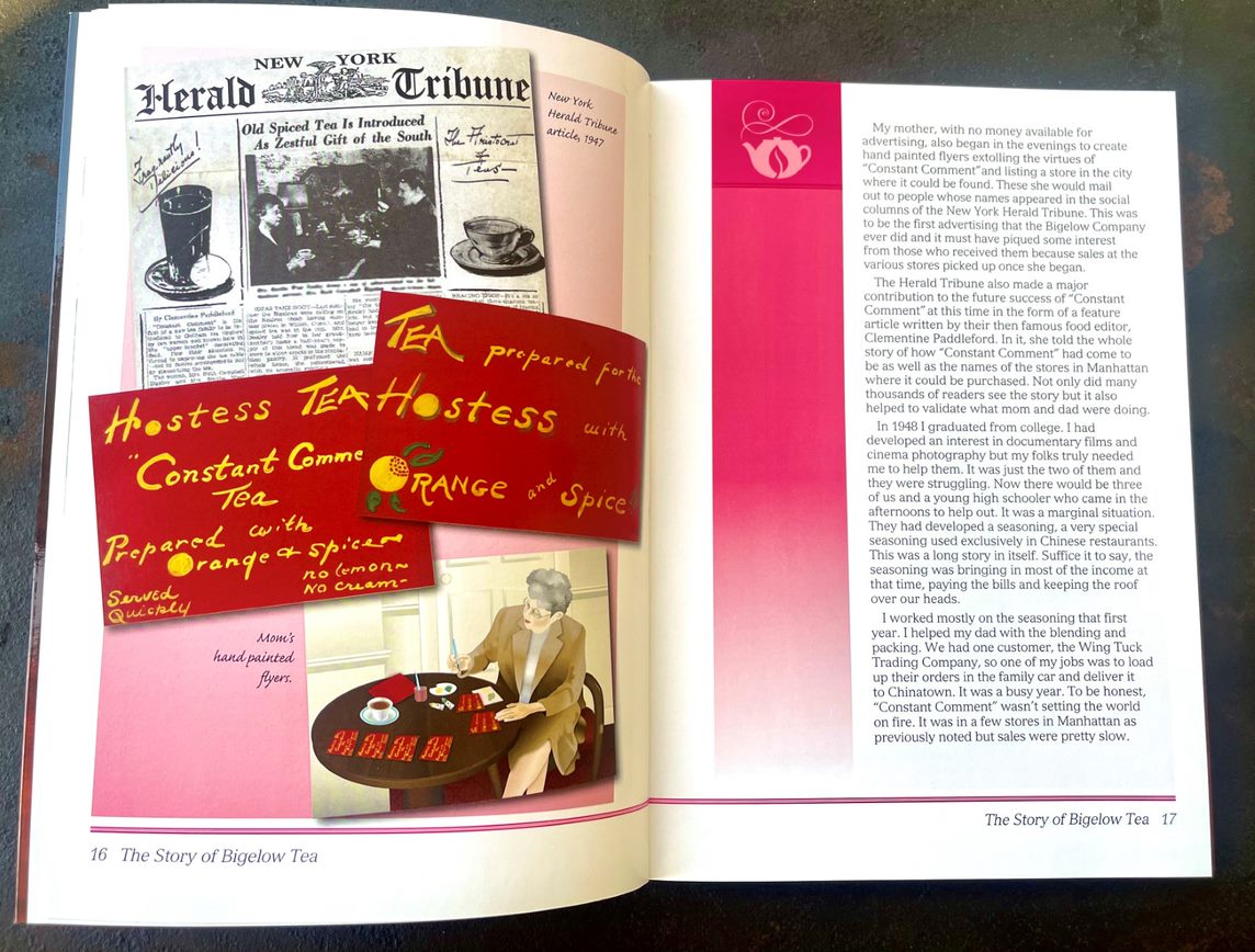 Written for Bigelow Tea fans. it tells the story of a company that began in 1945 when Ruth Bigelow disappeared into her kitchen for weeks. When she came out. she had created what would become America’s 1st specialty tea. Constant Comment